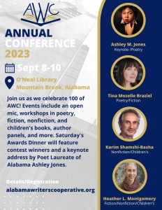 Annual conference hosted by Alabama Writer’s Cooperative. September 8th-10th. For details and to register: https://alabamawriterscooperative.org/2023-awc-conference