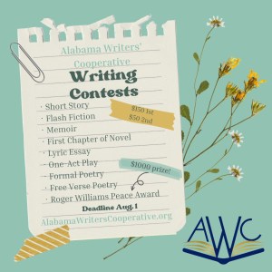 Writing contest hosted by Alabama Writer’s Cooperative. Deadline August 1st. For details and to enter: https://alabamawriterscooperative.org/2023-contests