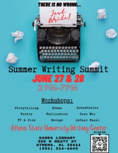 Free weekend workshop hosted by Athens State University. June 27th & 28th. In-person and online options are available. For details and to register: https://www.athens.edu/event/summer-writing-summit/